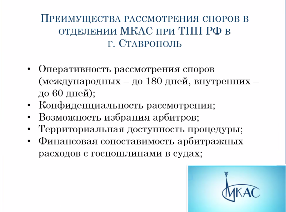 Модератор ВКС, вице-президент ТПП СК Любовь Валовая, будучи куратором повседневной работы по популяризации и повседневной деятельности Отделения МКАС в городе Ставрополь, предложила ответственному секретарю Ставропольского отделения МКАС Ольге Войтехиной доложить о преимуществах коммерческого арбитража при ТПП РФ.