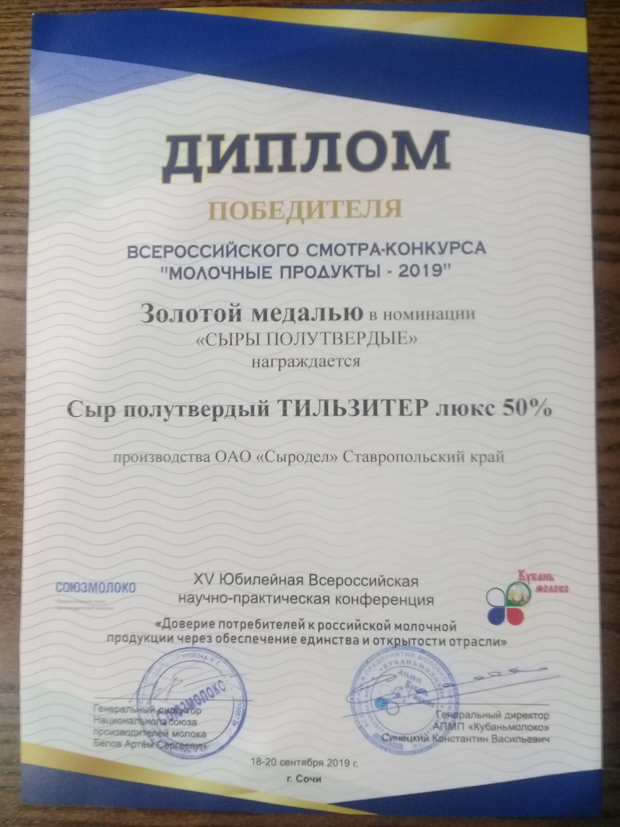 Золотую медаль и диплом победителя в номинации «Сыр полутвердый ТИЛЬЗИТЕР люкс 50%» получил продукт производства ОАО «Сыродел».