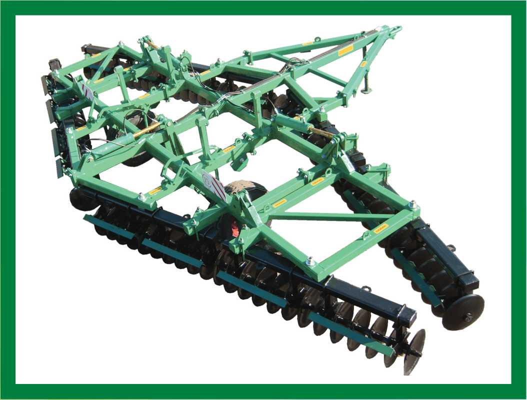 Механизм складывания дисковых крыльев обеспечивает их надежную фиксацию при транспортировке. Управление складыванием крыльев и поднятие (опускание) бороны в транспортное и рабочее состояние производится из кабины трактора. Оригинальная ромбовая конструкция бороны, позволяющая компактно разместить два ряда рабочих органов и обеспечивать соответствие требованиям по габаритам в транспорте. Простая конструкция механизма изменения угла атаки батарей дает возможность обработки любых почв.