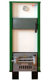 Теплообменник трубного типа. В топке котла расположено горизонтально 16 труб диаметром 32 мм, связанных с рубашкой котла. Котел изготовлен из стали 4 мм, что увеличивает срок службы котла до 20 лет. КПД котла не менее 85%. Дымоход прямоугольного типа расположен на задней стенке котла. Возможна комплектация котла переходником дымохода под вертикальную круглую трубу с устройством сажесборника.