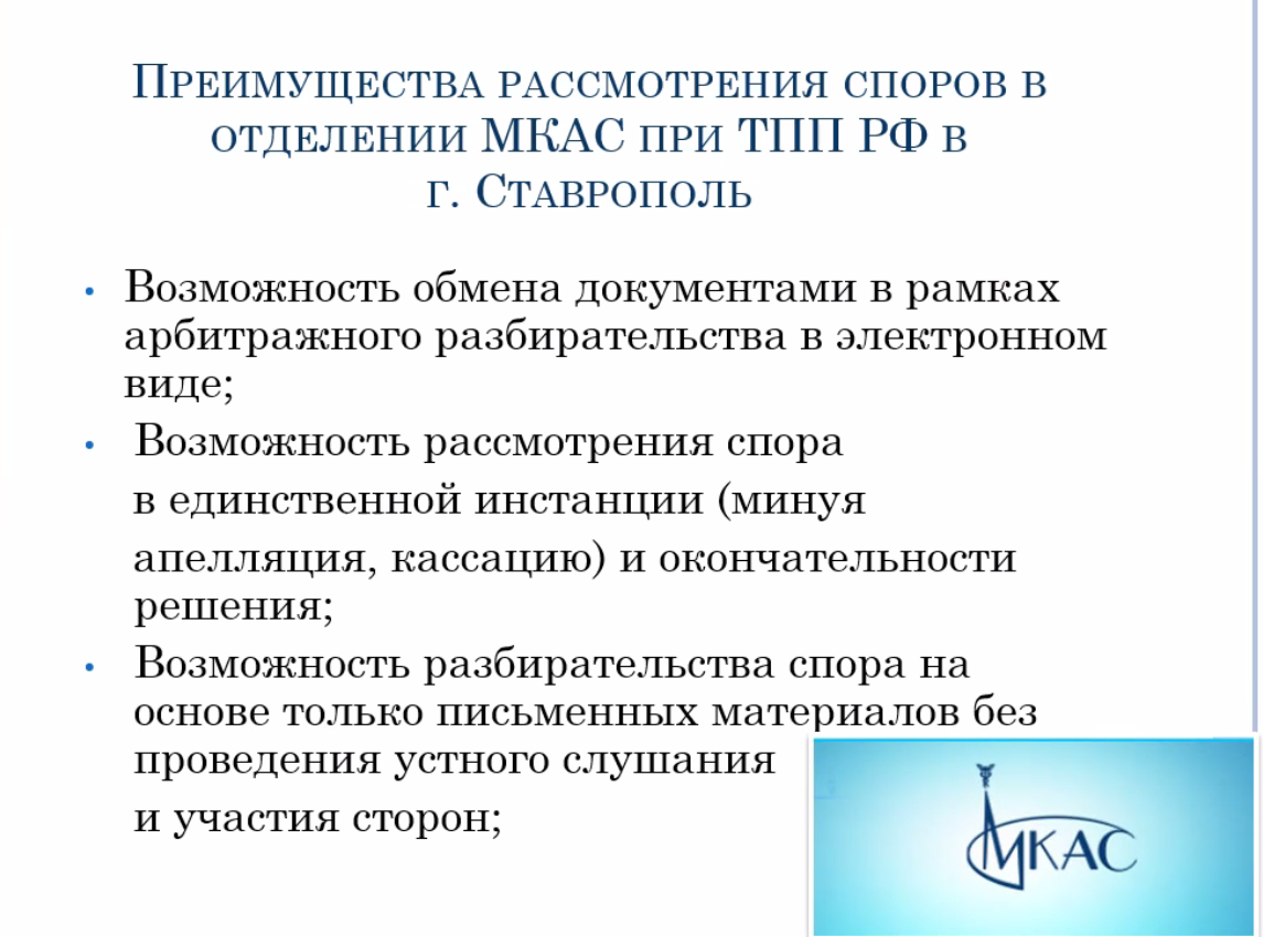 Модератор ВКС, вице-президент ТПП СК Любовь Валовая, будучи куратором повседневной работы по популяризации и повседневной деятельности Отделения МКАС в городе Ставрополь, предложила ответственному секретарю Ставропольского отделения МКАС Ольге Войтехиной доложить о преимуществах коммерческого арбитража при ТПП РФ.