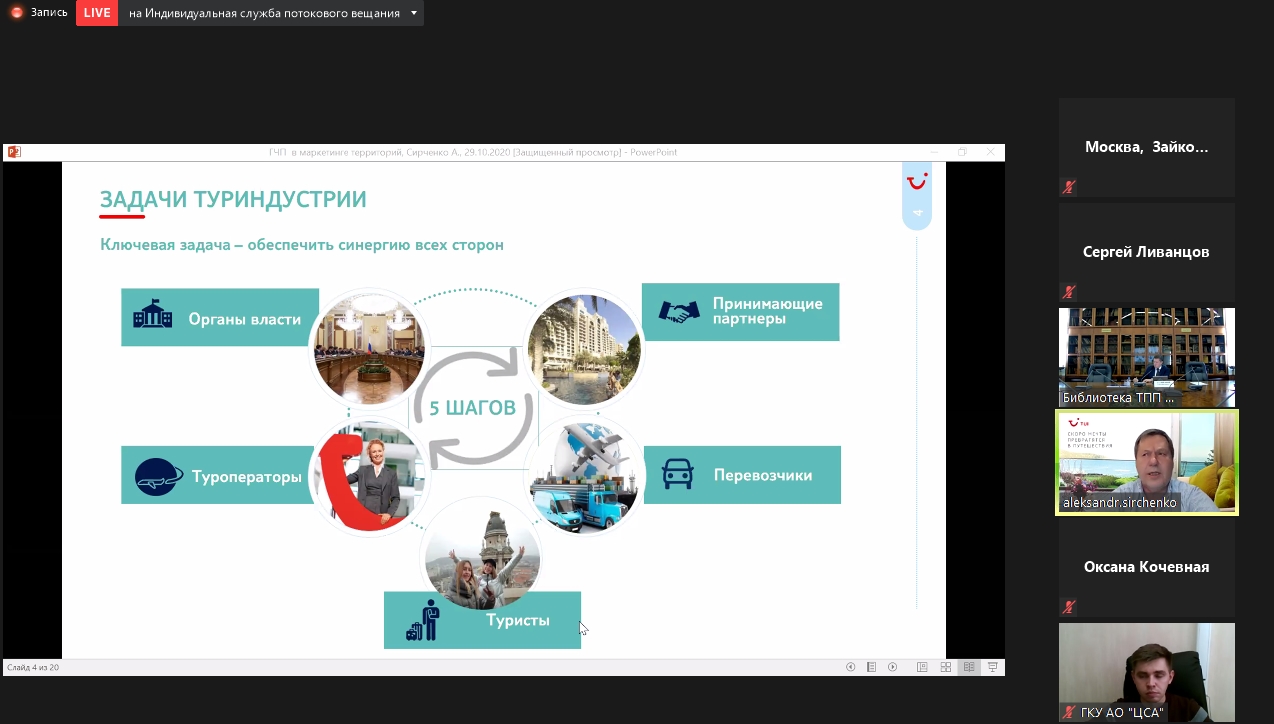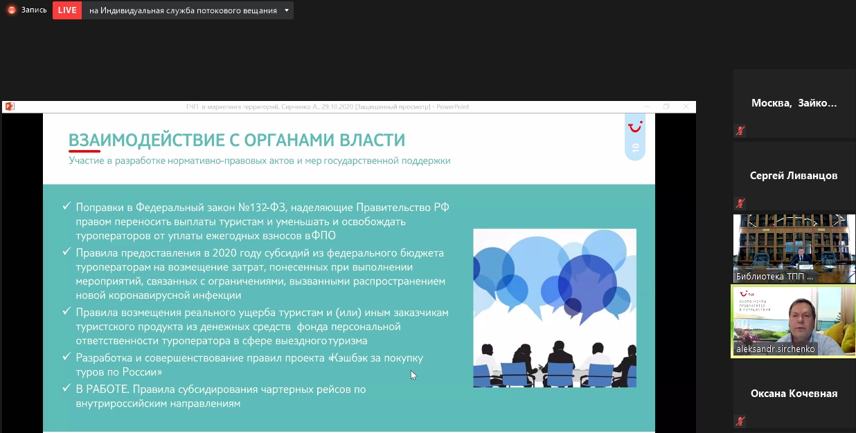На этот раз вебинар был на тему: «Государственно-частное партнерство в маркетинге территорий». Организаторами мероприятия выступили ТПП РФ и Евразийское содружество специалистов туриндустрии (ЕСОТ - прим).