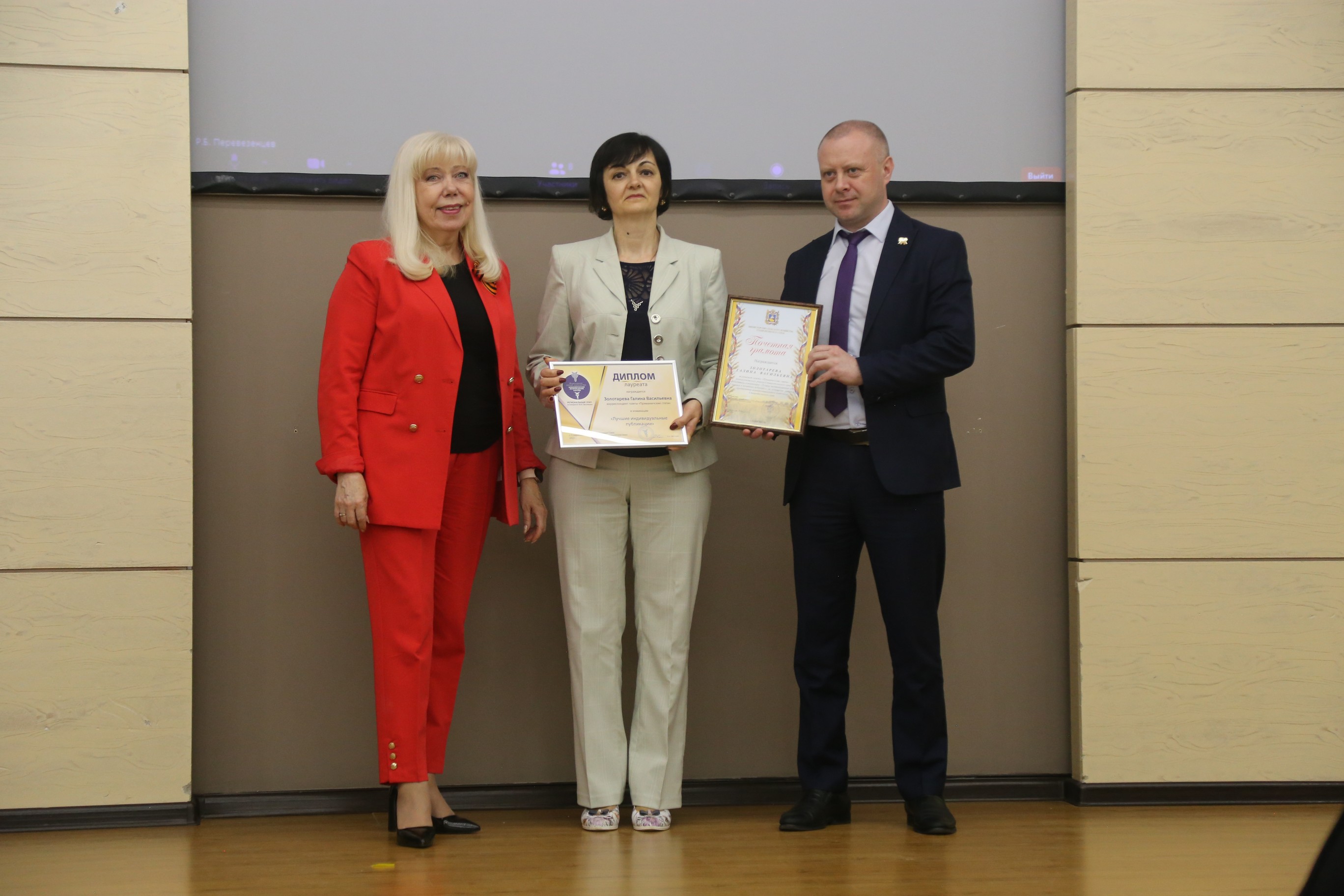 Особые слова и поздравления прозвучали в адрес победителя федерального этапа Конкурса в специальной номинации «За освещение российского АПК» Галины Васильевны Золотаревой, газета "Приманыческие степи" Апанасенковского района Ставропольского края. Поздравления и подарки ей вручила вице-президент ТПП СК Любовь Валовая. Региональный минсельхоз наградил Галину Золотареву грамотой.