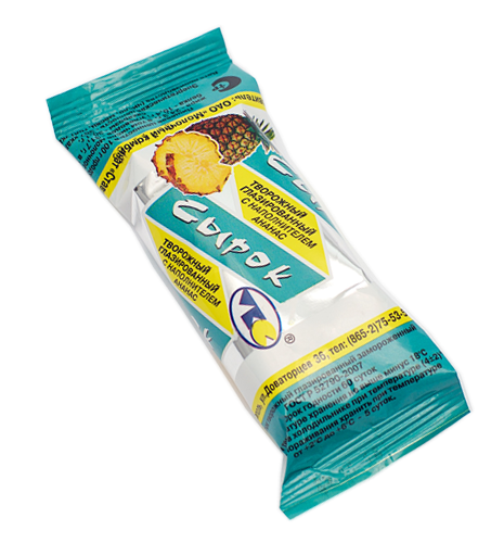 Состав: творог, сахар, глазурь «Ставропольская» (жир растительный, сахар, какао-порошок, эмульгатор лецитин, ароматизатор ванилин) , фруктовый наполнитель «Ананас» (ананас, сахар, стабилизаторы: крахмал кукурузный, пектин; регуляторы кислотности: лимонная кислота, цитрат натрия; красители: каротины, куркумин ), масло сливочное, ароматизатор ванилин.